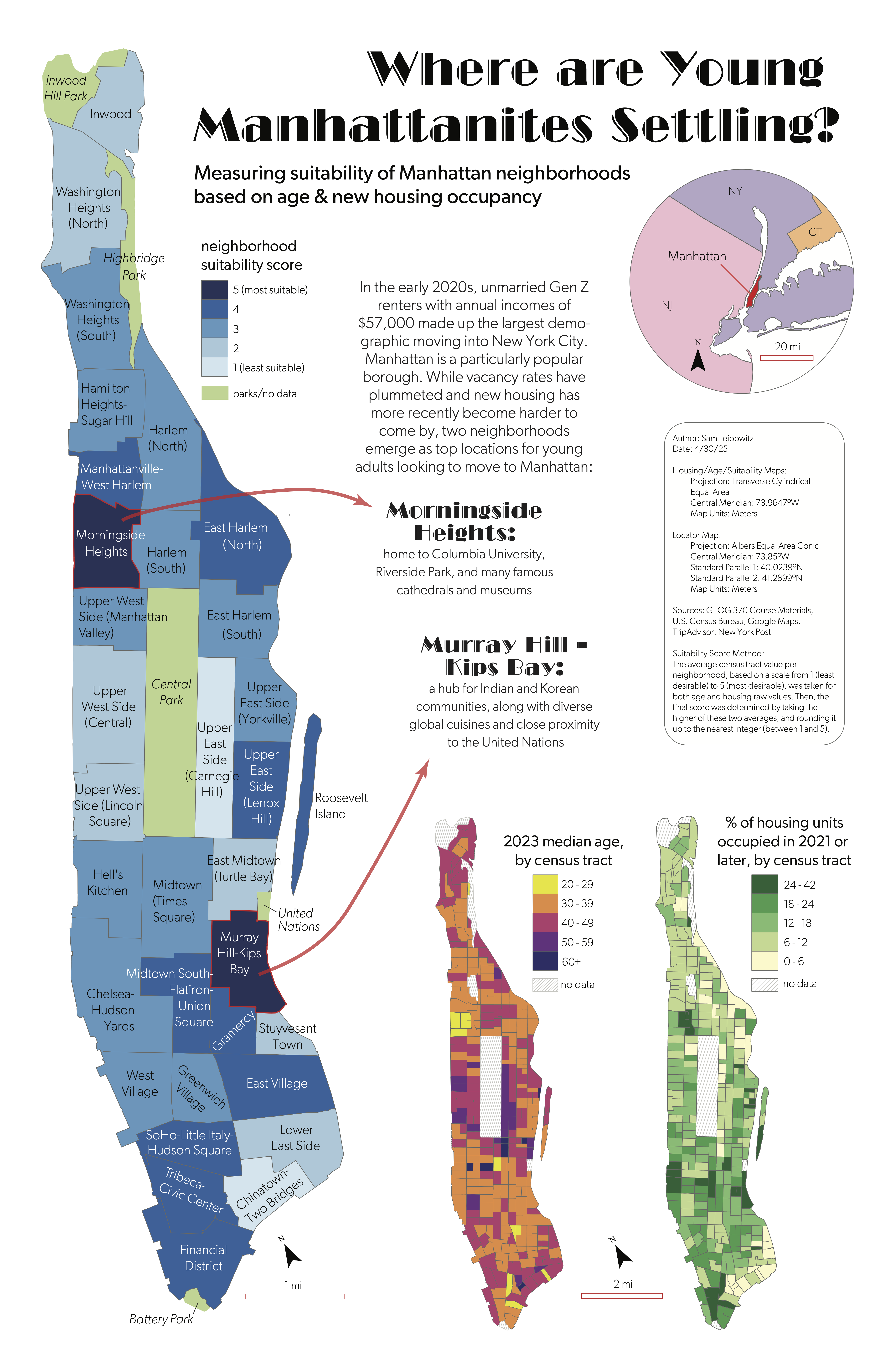 This was a self-driven final project combining all material covered in GEOG 370, including cartographic design principles, generalization, map projections, data collection and analysis, ArcGIS Pro, and Adobe Illustrator. I decided to map the "best locations" for a young adult moving to Manhattan based on (1) which census tracts they would find the most people similar in age, and (2) which census tracts they would find the most other new residents. I collected population data from the U.S. Census Bureau and performed a few calculations to achieve a final "suitability" choropleth map by census tract. One caveat of this map is that I did not consider cost of living -- Manhattan is notoriously expensive. Overall though, I am very pleased with how it turned out.